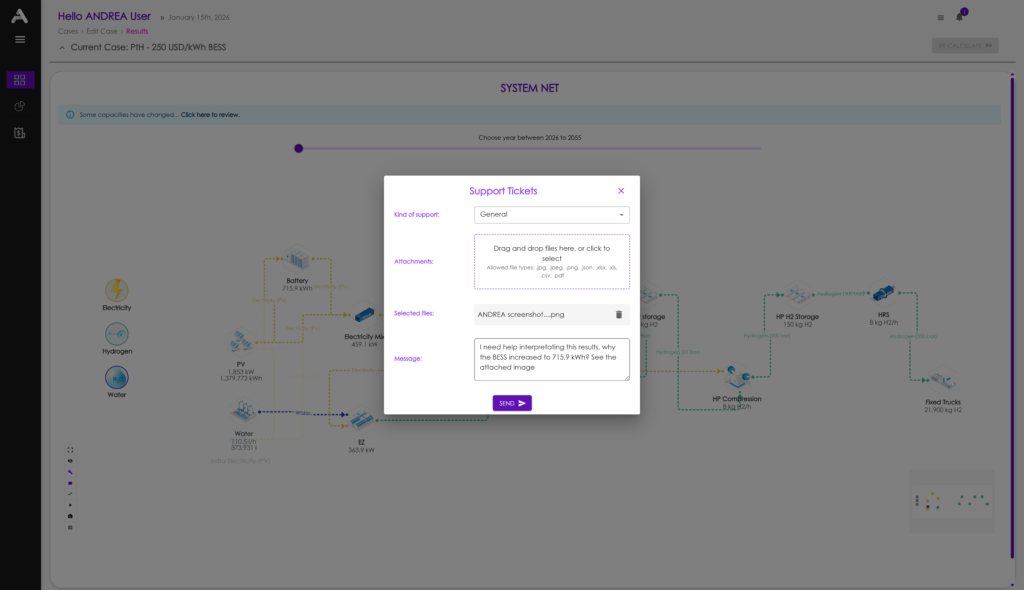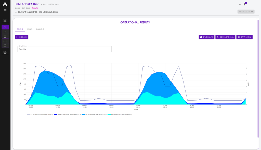 Reaching that point was a gradual process. ANDREA was shaped through more than four years of use with Hinicio’s clients and over 100 modeled projects. This journey allowed the platform to evolve into an advanced, intuitive, and flexible solution that combines simulation and optimization, enabling users to identify optimal system configurations while simultaneously accounting for technical, economic, and regulatory variables.